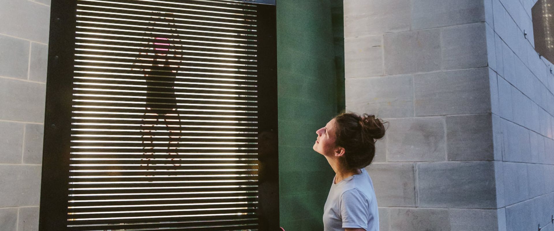 La tête ailleurs est un jeu optique qui rend hommage à l’ombro-cinéma, une ancienne technique d’animation permettant de créer l’illusion du mouvement avec des images fixes qui défilent derrière une trame d’écran simple. Le mécanisme s’active lorsqu’un passant tourne la manivelle pour voir apparaître un haïku visuel composé d’un un oiseau en plein vol, d’un œil clignotant et d’un personnage qui nage la brasse. L’ensemble est accompagné d’une douce trame de carillons qui tintent au gré du mouvement.