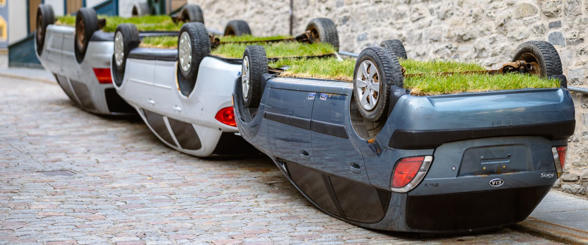 Dans la vision utopique d’un monde où l’automobile serait devenue obsolète, une série de trois voitures garées sont renversées, remplies de terre et recouvertes d’une pelouse immaculée qui ne demande qu’à être investie d’un bain de soleil ou d’un pique-nique. Le stationnement de rue est ainsi écarté pour laisser place à un lieu de convivialité et au verdissement de l’espace public. La voiture ainsi récupérée et réaffectée renvoie également à la critique du capitalisme et à l’urgence écologique.